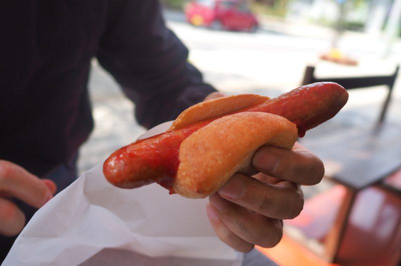 軽くケチャップがかけられて、パンに挟んだ状態で登場しました🍞