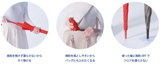 コンセプトは「濡らさない傘」であり、サッと一振りすれば傘についた水滴が無くなり、持ち運ぶときにストレスなく使えるというもの💜